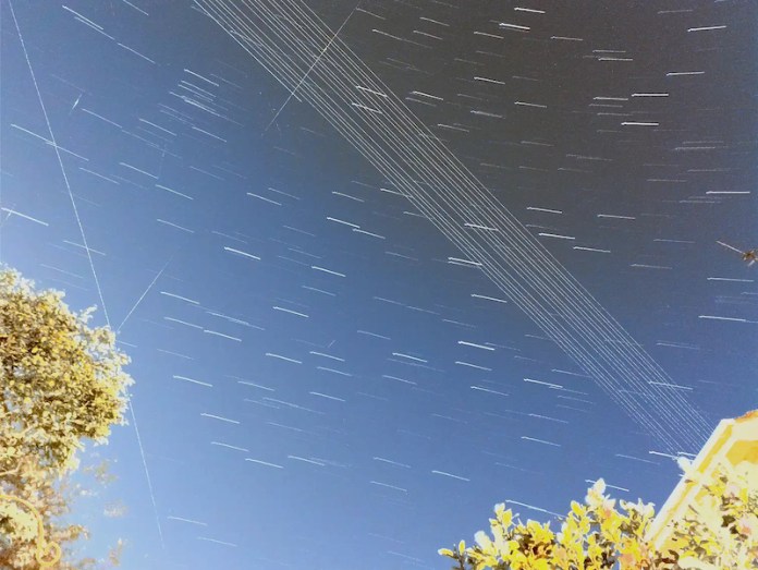 Starlink satellites are quite visible in the night sky. Image via The Conversation/ Shutterstock.