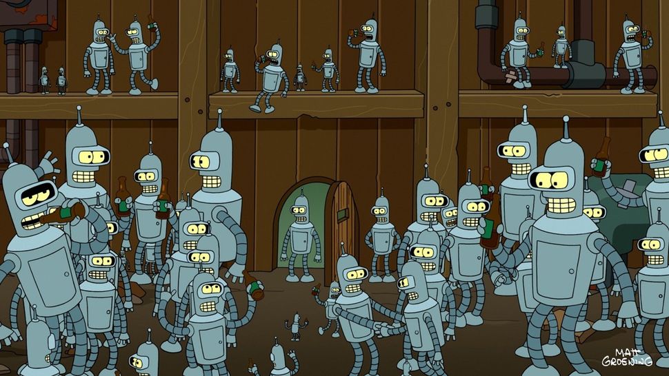In season eight episode “Benderama”, Professor Farnsworth invents the Banach-Tarski Dupla-Shrinker, a machine capable of creating two smaller copies of an object. The professor’s motivation is simple — he wants smaller sweaters and more of them because he’s shrinking and getting colder — but Bender sees the machine as an opportunity to duplicate himself. These duplicates then duplicate themselves into more duplicates, who duplicate themselves (ad infinitum) until the Earth is overrun by millions of tiny nano-Benders.