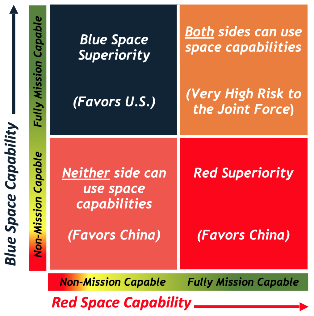 - In the lower right, China achieves space superiority over the U.S., the worst possible outcome for the U.S.