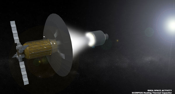 The novel design of SCORPIUS hinges on origami unfolding solar concentrators, and a “ThermaSat+” solar thermal propulsion system now under development by Howe Industries, a SCORPIUS project partner with RSA. SCORPIUS uses the large solar concentrators to heat up the tungsten block of the ThermaSat+ system, melting encapsulated boron in the tungsten and storing significant amounts of energy in the phase change from solid to liquid. Once fully charged, the tungsten block vaporizes propellant at temperatures hot enough to melt steel and generates enough thrust to perform an impulsive burn.