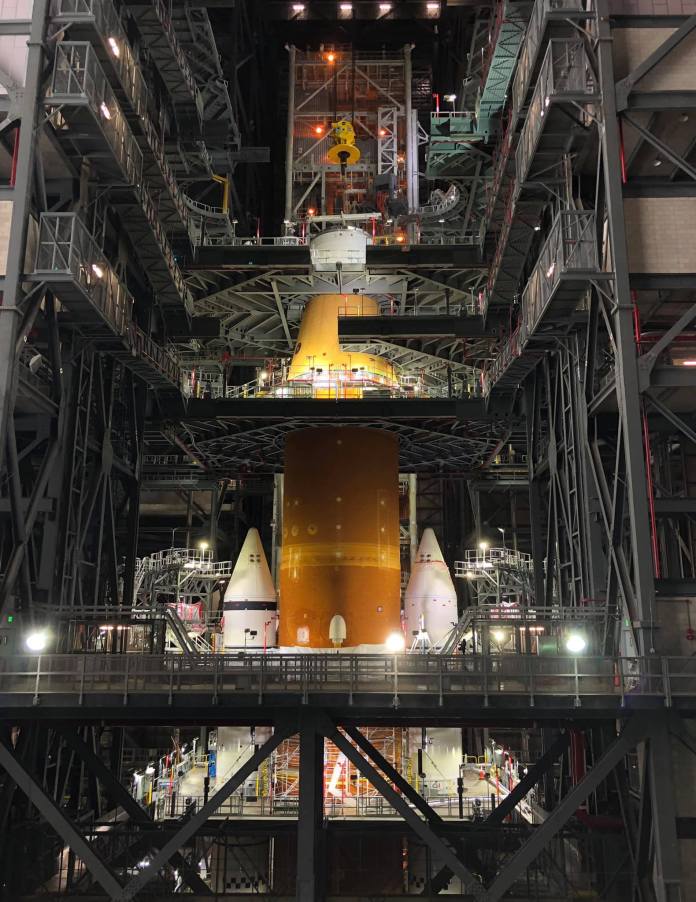 The massive core stage is the largest booster ever built and weighs over 188,000 pounds unfueled and now stands atop the launch platform in High Bay 3 inside the VAB for the first time ever- marking a major milestone on the path to first launch on Artemis 1.