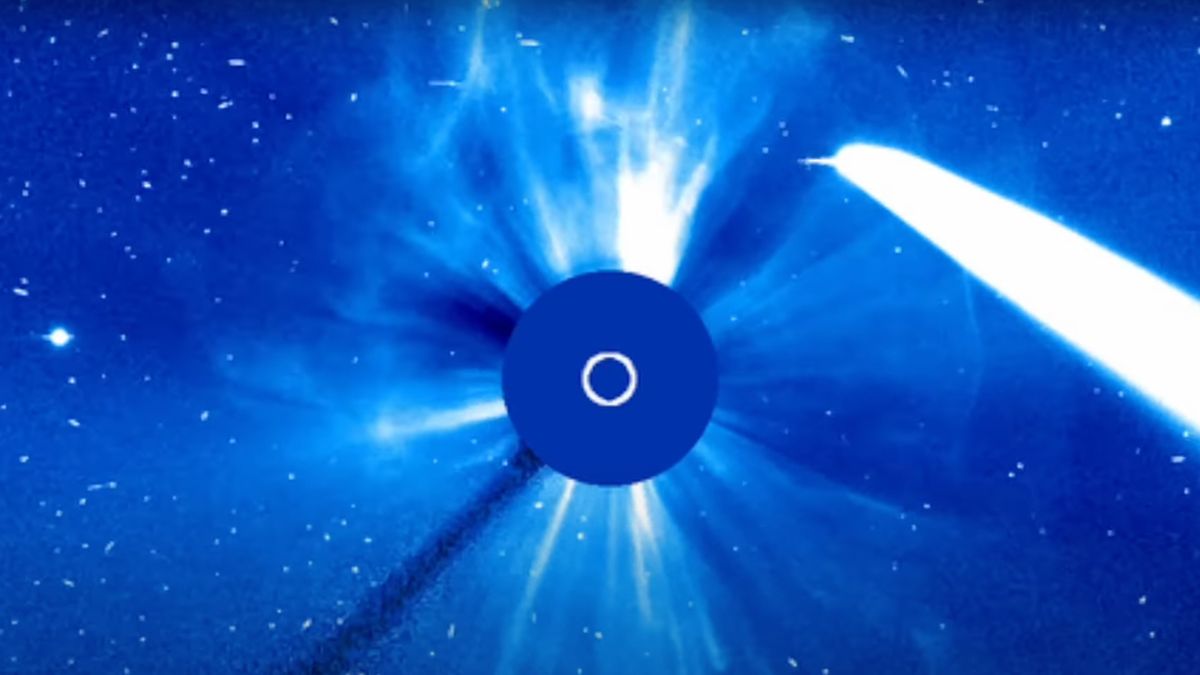 The ESA-NASA SOHO spacecraft captured this view of Comet Tsuchinshan-ATLAS (bright white streak at right) during a solar eruption on Oct. 9, 2024. (Image credit: ESA/NASA/SOHO)