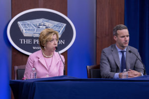 Undersecretary of defense for acquisition and sustainment, ellen Lord, briefs reporters in the Pentagon. Credit: DoD