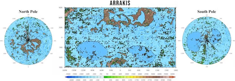 In desert Arrakis, temperatures would reach 70°C or more, while in its ocean state, we put the highest recorded temperatures at about 45°C. That means the ocean Arrakis would be liveable even in summer. Forests and arable crops could grow outside of the (still cold and snowy) poles.