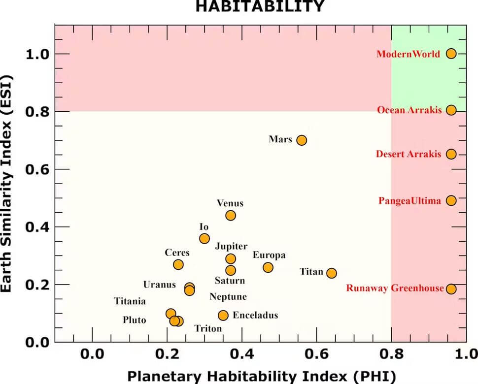 It’s also important to note that, though distance from their local star can give a general average temperature for a planet, such an average can be misleading. For instance, both desert and ocean Arrakis have a habitable average temperature, but the day-to-day temperature extremes on the ocean planet are much more hospitable.