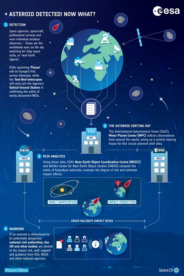 “ESA’s Planetary Defence Office is in regular close contact with all major organisations monitoring asteroid risk, from NASA’s Planetary Defense Coordination Office and their Center for NEO studies, to the UN-endorsed committees that help coordinate the global effort.