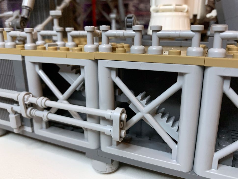 Beginning from outside the base of the ML and continuing up two levels and then on the deck at the bottom of the tower, Lego designers repurposed grilled slopes and Lego Technic racks to represent staircases. These flights of steps (along with the railings, represented using Lego water taps) provide a sense of scale.