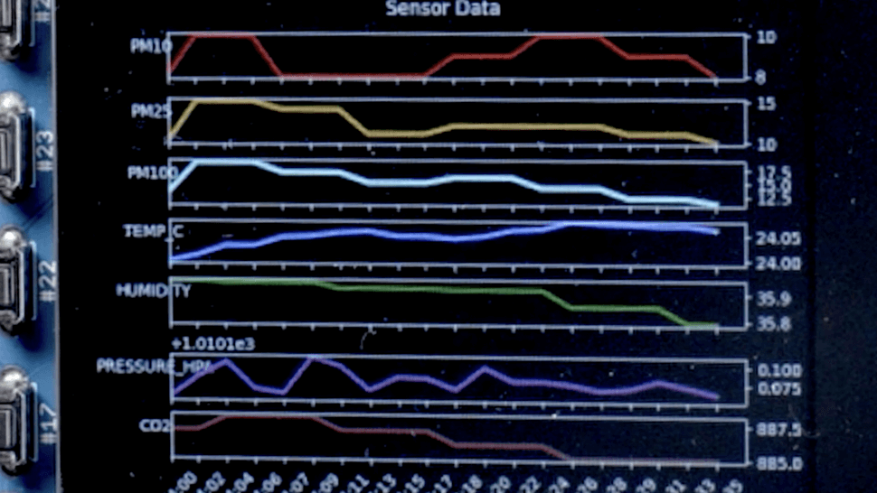 After we get the sensor data, we can log it to a file, graph it, set up alerts based on threshold values, and more. In our video, we display a graph that represents an hour’s worth of readings from all sensors, and we change the color of the graph based on values we set as “warnings” and “critical.” For instance, if the CO2 concentration goes above (x), the graph will turn red to show that it’s at unsafe levels.