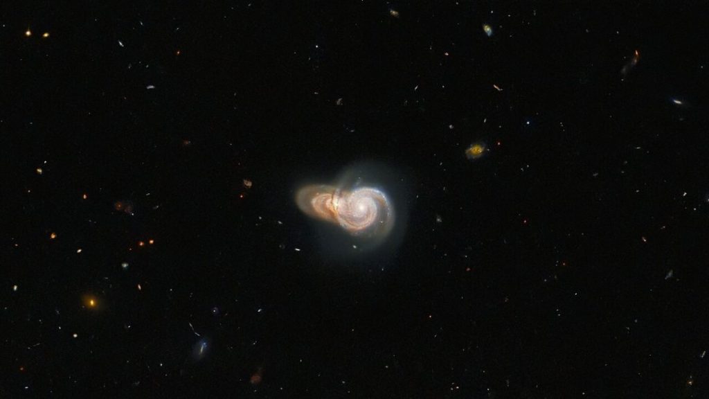 The galaxies, called SDSS J115331 and LEDA 2073461, are located more than a billion light-years from Earth. While the new Hubble Space Telescope view suggests the two galactic bodies are merging, it’s just an optical illusion and the galaxies aren’t actually interacting with each other at all, according to a statement from the European Space Agency (ESA), which is a partner on the observatory.
