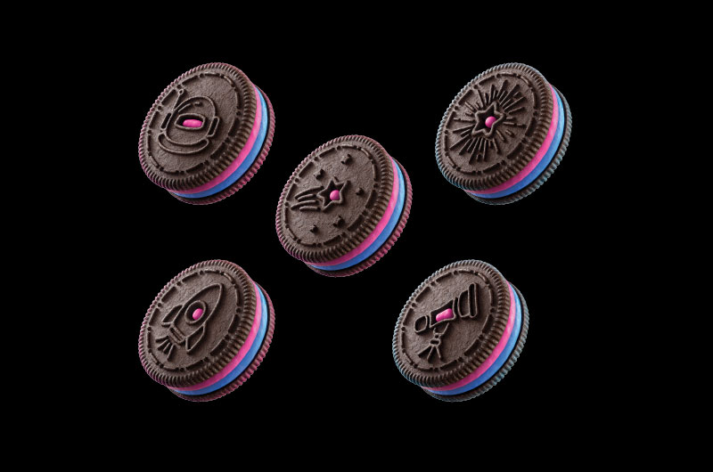 Oreo Space Dunk cookies also feature one of five “galactic” embossments and, for the first time in the brand’s history, a small cut out in the cookie itself, providing a peak inside at the nebula-inspired filling.