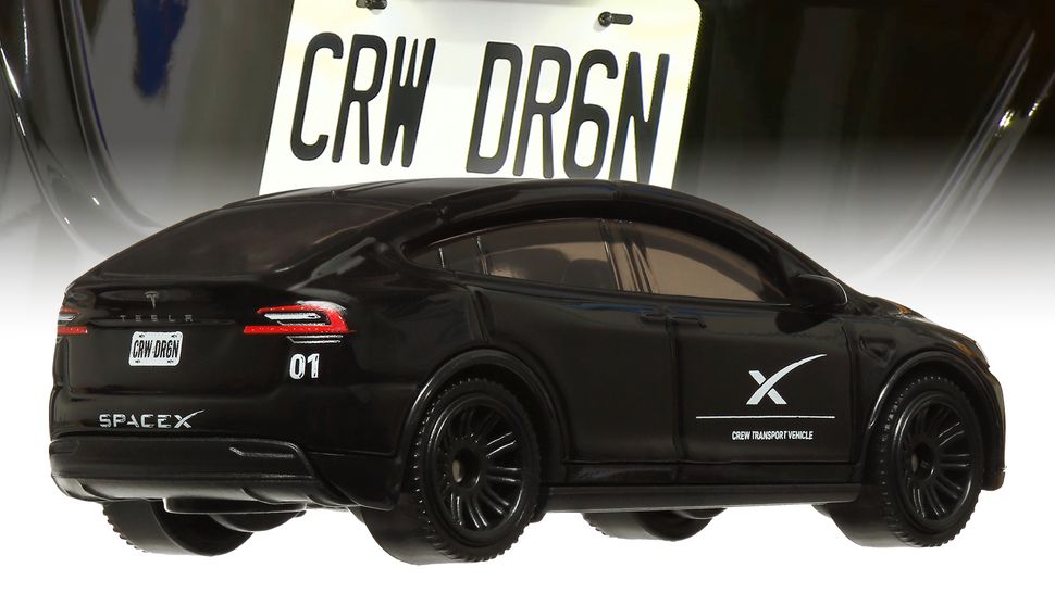 The Matchbox Crew Transport Vehicle has a rear-mounted license plate that reads “CRW DR6N” (Crew Dragon). The same plate was used by SpaceX’s Crew-6 in 2023, the company’s sixth mission to ferry astronauts to and from the International Space Station for NASA, and the first to use the black Model X cars.
