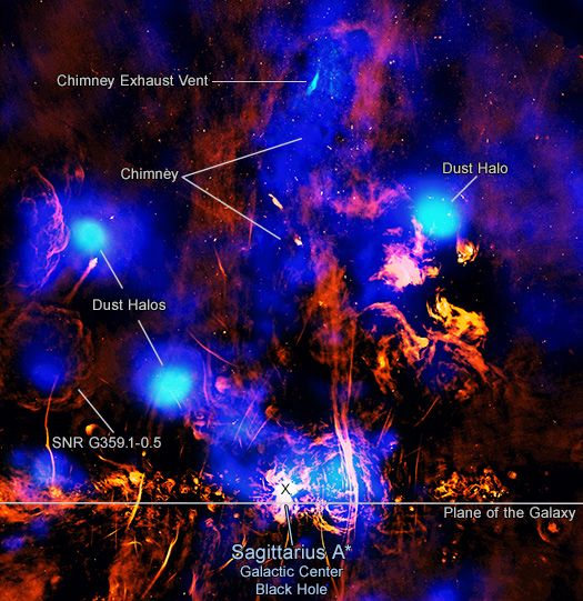As for where this jet of hot gas is coming from? Scientists think that, as material falls toward Sgr A*, the supermassive black hole erupts, and this pushes that matter up through the chimney and out along the vent. What remains to be determined, however, is just how frequently matter falls toward Sgr A*.
