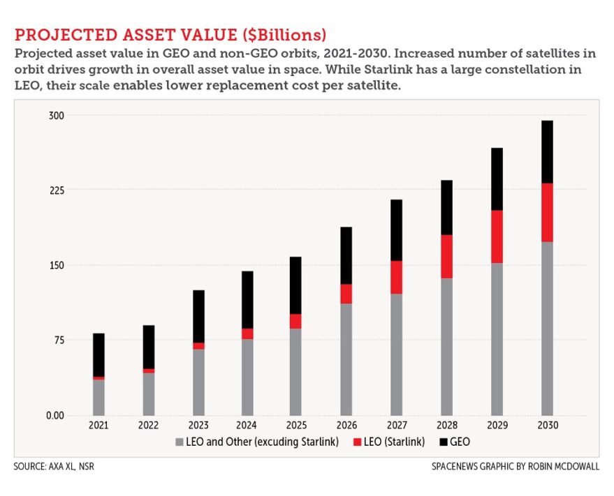 If insurance and operational costs are already critical factors driving economic choices in the current operating environment, they become even more so in projected scenarios for 2030, where there may be more than 52,000 satellites in LEO alone, and a further 1,000 in GEO, according to analysis of projections based on data from AXA XL and Northern Sky Research. The total asset value of these satellites may be as high as $230 billion, up from $38 billion today.