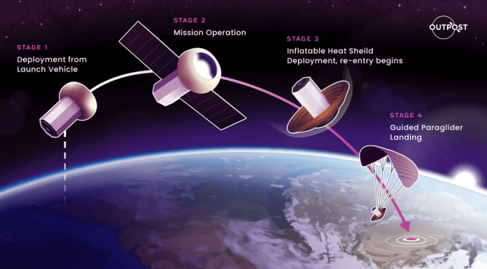 Outpost plans to return satellites weighing about 200 kilograms. In contrast to space capsule return flights that rely on rigid ablative heat shields, ballistic atmospheric entry and parachutes opening at low altitudes, Outpost has developed “lightweight and compact” systems that “deploy using pneumatic inflation,” Vergalla said.
