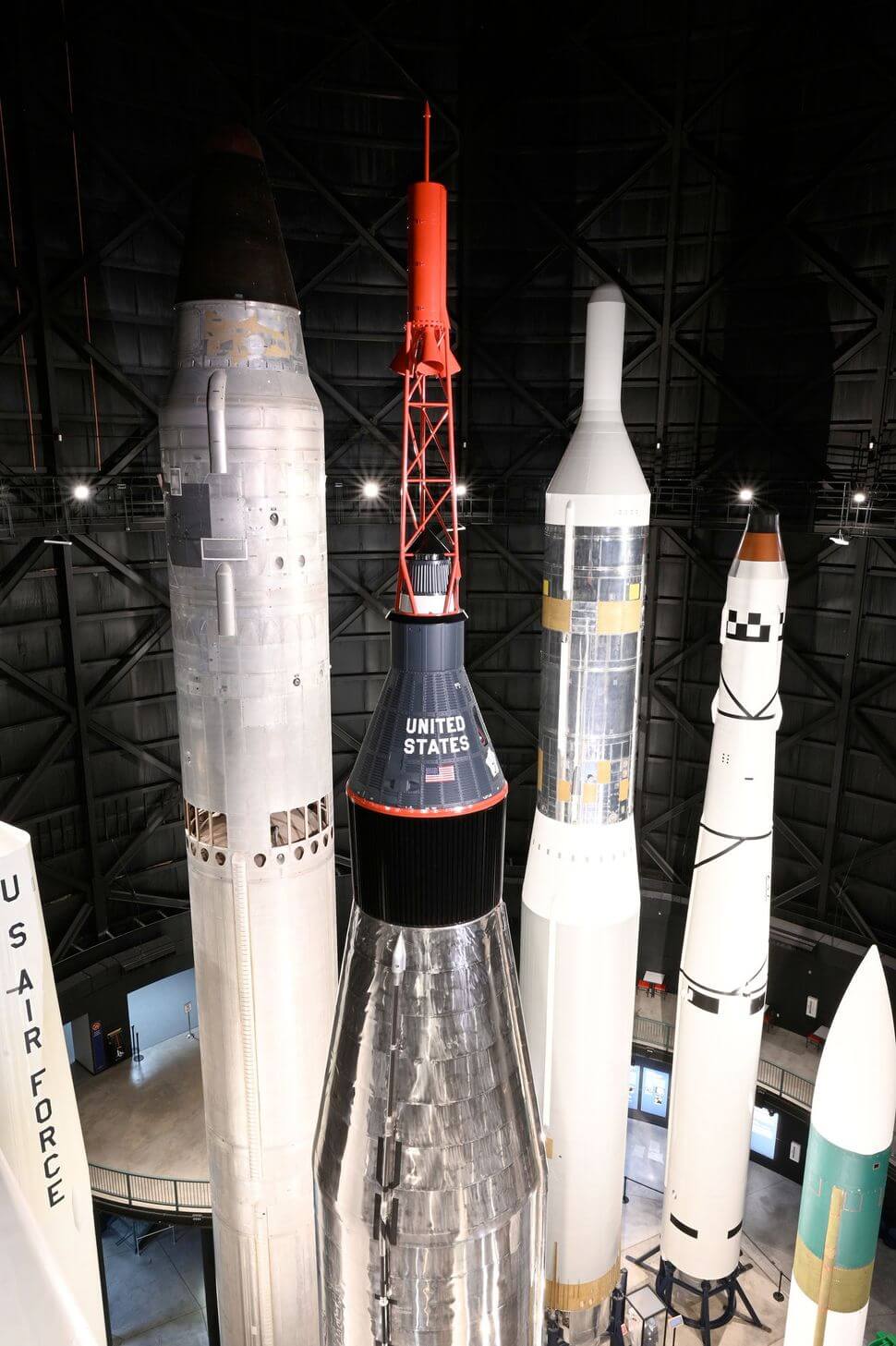 On Monday (April 29), a week after the rocket’s arrival, a crane was used to raise the 95.4-foot-tall (29-meter) Atlas upright and position it among the eight other missiles in the gallery. Designed to resemble a silo, the 140-foot-tall (43-meter) room also includes a Titan II like the type that was converted for NASA’s follow-on two-man program, Gemini.