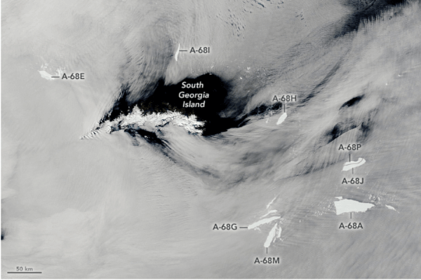 A new study, based on satellite data, tracks the aftermath of the once-mighty iceberg A-68a, which held the title of world’s largest iceberg for more than three years before shattering into a dozen pieces. (NASA’s Earth Observatory once dubbed the various mini-bergs “alphabet soup.”)