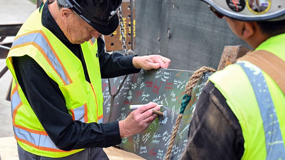 The steel beams, each signed by the hundreds of construction workers, project managers and science center staff and supporters who have made this 200,000-square-foot (18,600 square meters) expansion possible, were lifted one at a time, one each hour, starting at 7:30 a.m. PDT (10:30 a.m. EDT or 1410 GMT). After the beams were in place and, observing tradition, a small spruce tree was placed atop the topmost point, a ceremony (on the ground) was followed by a barbecue lunch for the whole team, including MATT Construction, ZGF Architects, building engineers Arup and Plas-Tal Manufacturing.