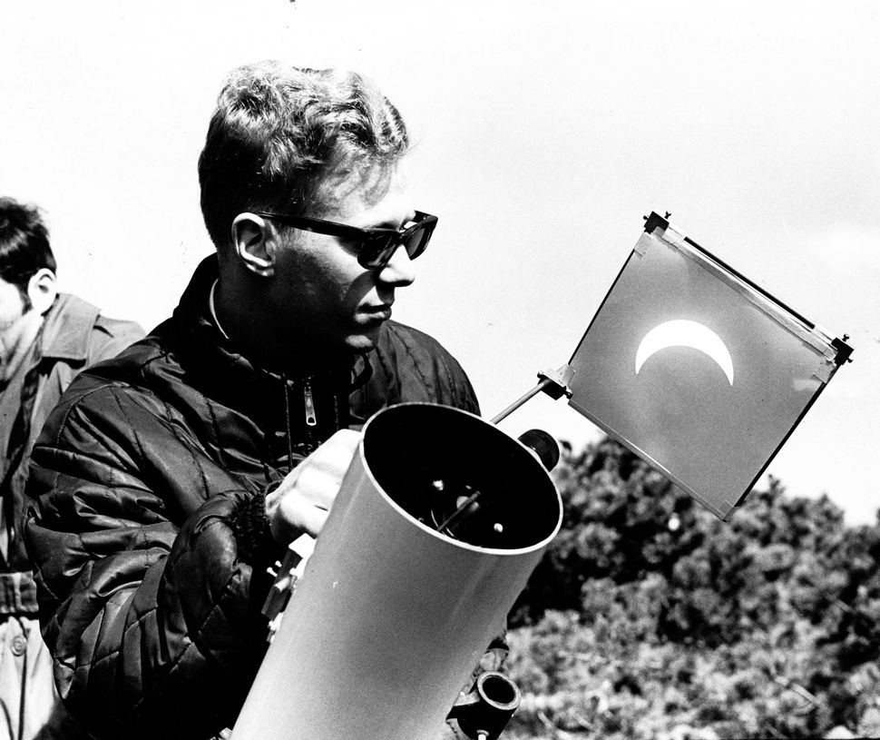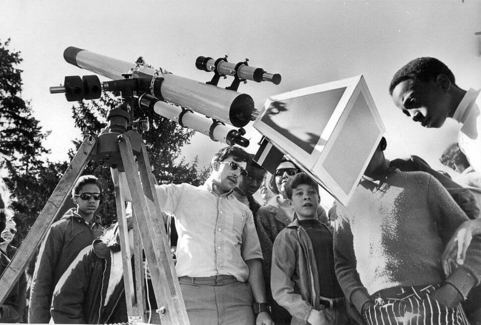 Ronald Cody, a second year graduate student in physics at Rutgers, uses a telescope to view the total solar eclipse in Nantucket, Massachusetts on March 7, 1970.