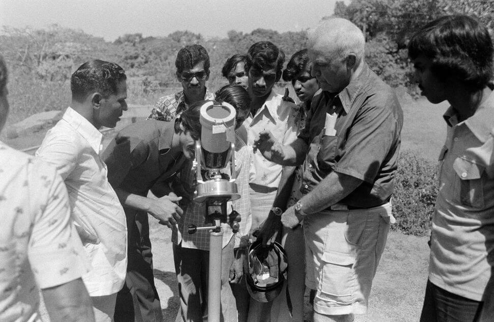 A group of people observe the solar eclipse with a delegation of scientists from Canada and the United States on Feb. 16, 1980, in Karwar, India