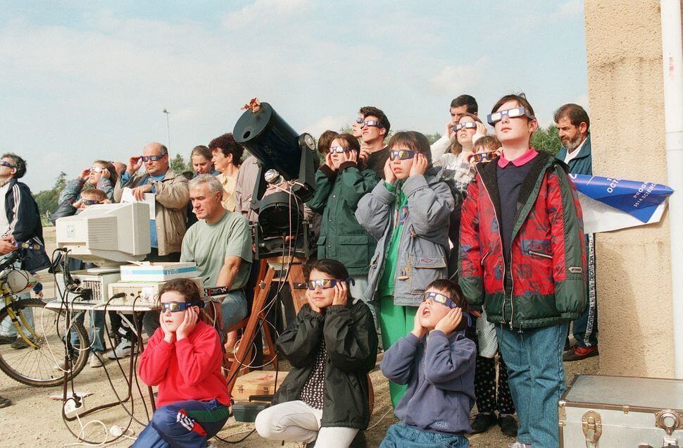 People gather to observe a partial solar eclipse with eclipse glasses on Oct. 12, 1996, in Saint Renan, western France.