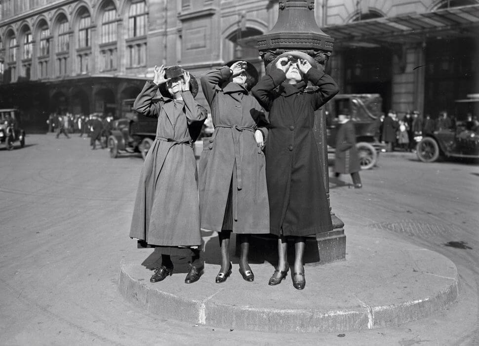 On April 8, 1921, a partial solar eclipse was visible over France. Here three women in Paris, France watch the eclipse unfold.
