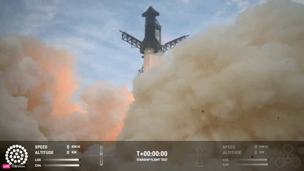 Cheers erupted from the South Padre crowd as the dim morning sky was illuminated by the ignition of Starship’s 33 first-stage Raptor engines, which quickly shrouded nearly the entire vehicle in a plume of dust and smoke. Seconds later, the 400-foot tall (122 meters) rocket rose from the plume, quickly increasing its climb skyward.