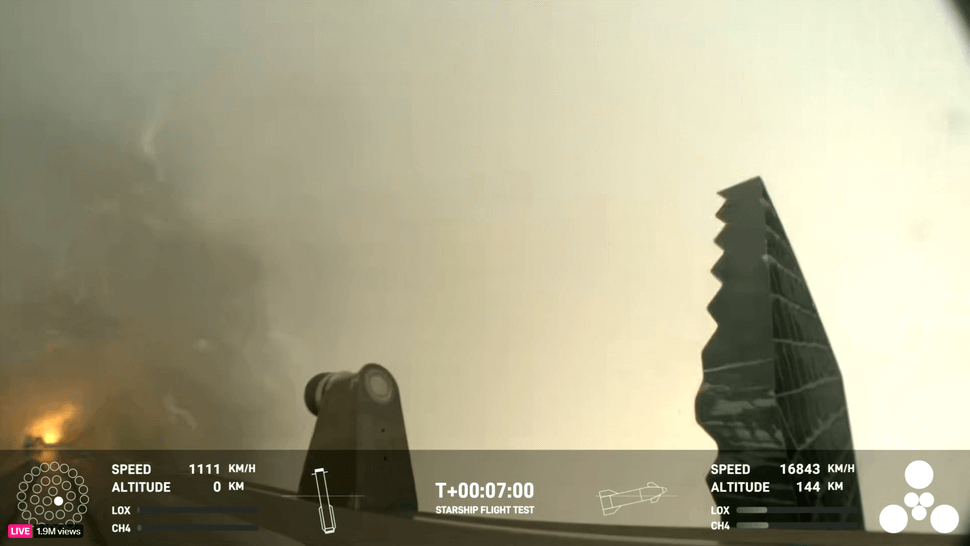 High in the sky, Starship’s two stages separated about 2 minutes 45 seconds after liftoff, sending the 165-foot-tall (50 m) upper-stage spacecraft onward to space while Super Heavy began preparations for a boostback burn to redirect its trajectory. That post-staging burn reversed Super Heavy’s velocity, and was intended to be followed minutes later by a landing burn above the Gulf of Mexico. However, it appears the Super Heavy’s engines did not relight as planned, leading to the loss of the booster.
