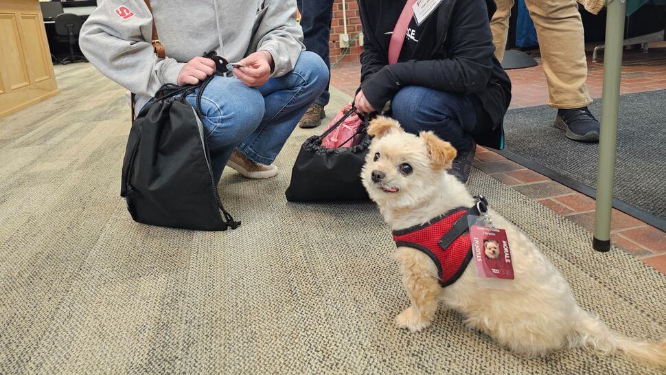 At first, Zadie wasn’t thrilled when I told her we’d be going to college orientation as a sort of pre-game for the solar eclipse. But after touring the school’s art and science departments and main library — where we met Ted, a tiny pup who serves as SUNY Potsdam’s “Morale Officer” dog — she warmed up. Maybe because Ted’s handler was giving out buttons showing the dog wearing solar eclipse glasses.