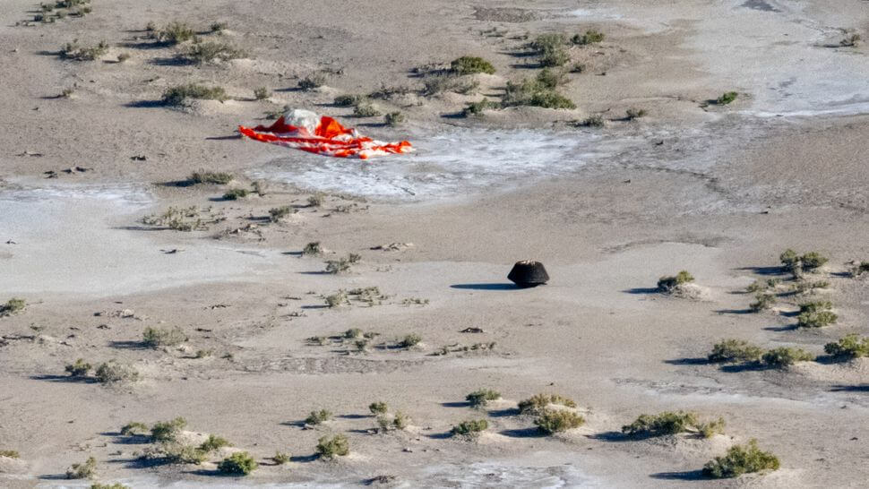 Following its fiery flight, the sample return capsule successfully deployed its main parachute and touched down for a soft landing at the Department of Defense’s Utah Test and Training Range.