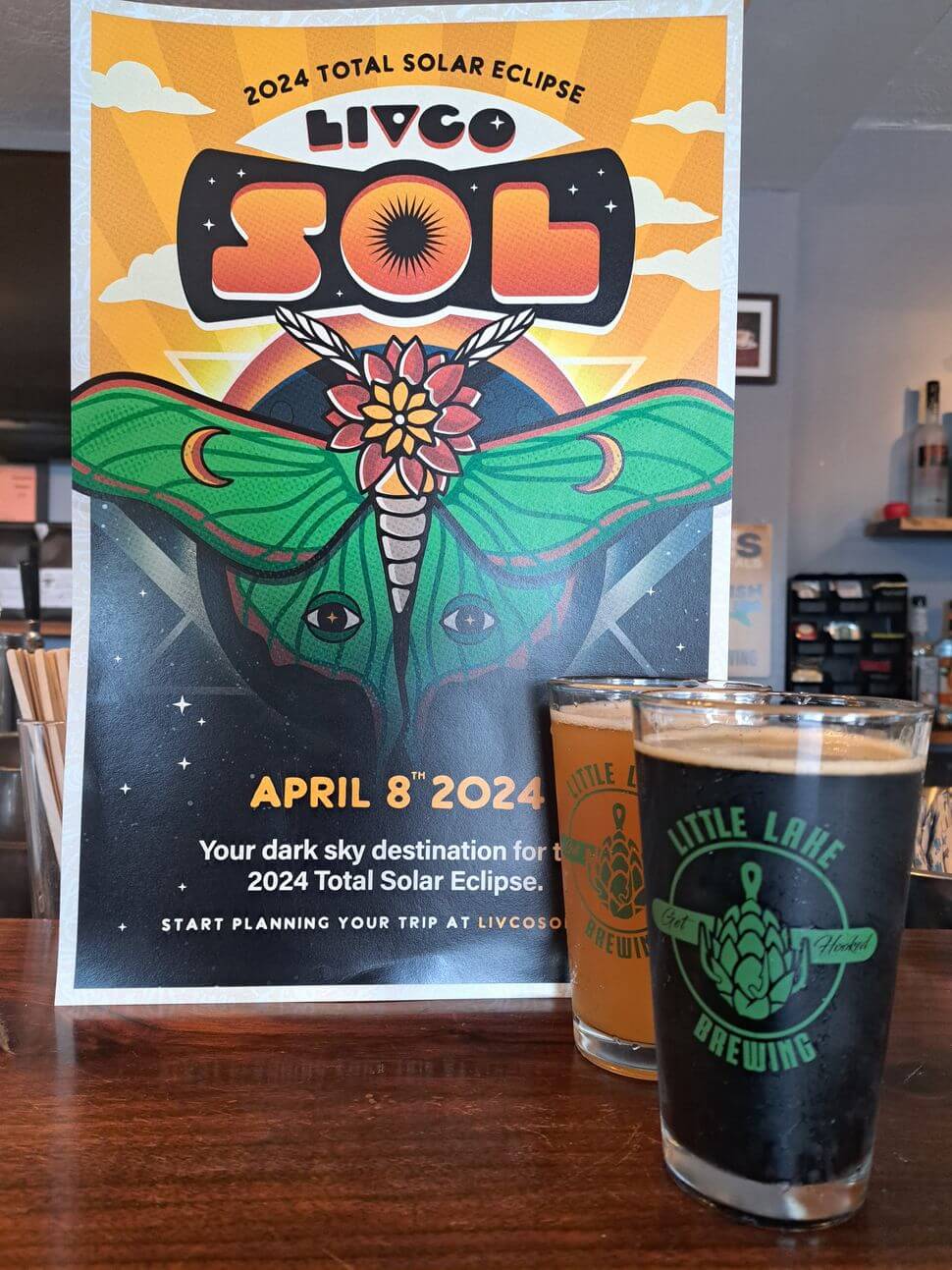 Don Carll, owner of Little Lake Brewing, explained the ins and outs of this beer so beautifully I’m going to just tell you exactly what he said: “The black and tan beer, inspired by the eclipse, presents an interplay of colors. Its dark core mirrors the shadowy totality of a solar eclipse, offering rich, roasted flavors. Surrounding this darkness is a tan layer, akin to the penumbral glow, with notes of caramel and toffee. This celestial-inspired beer harmonizes robust dark malts with lighter counterparts, creating a symphony of flavors in each sip.”