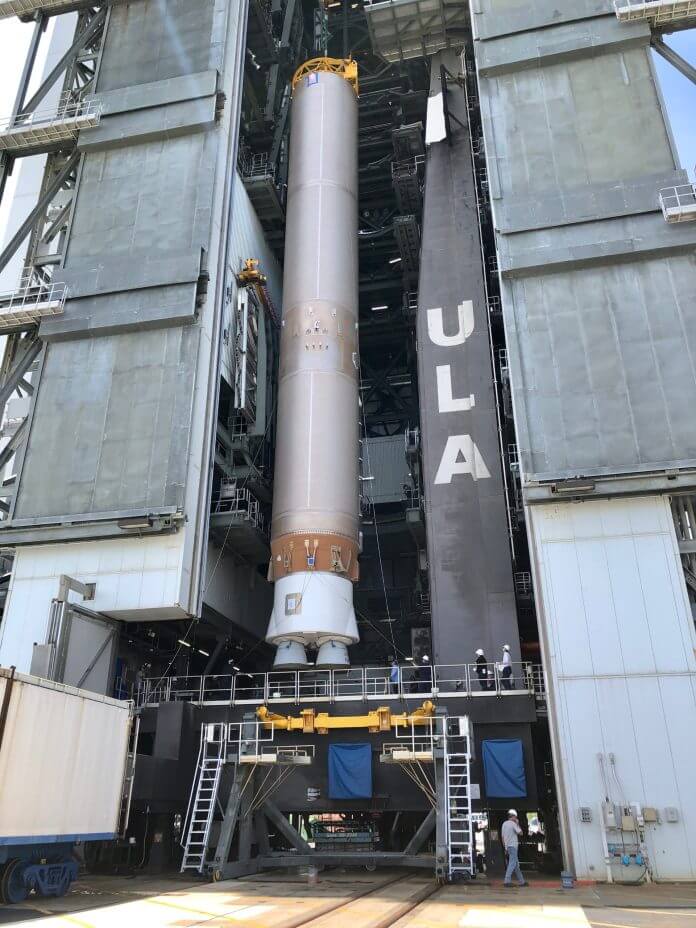 Atlas V assembly and stacking operation began at pad 41 on June 17, when the first stage was brought to the 30-story-tall Vertical Integration Facility (VIF) and hoisted aboard the Mobile Launch Platform (MLP).