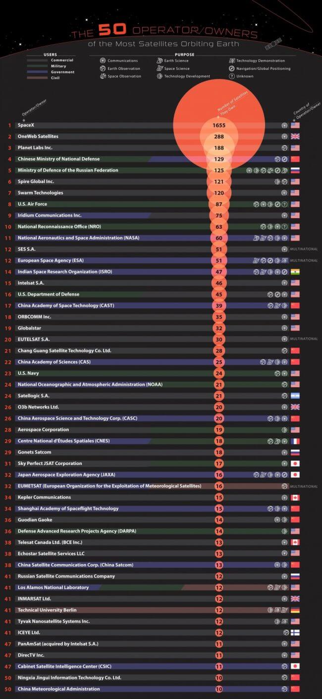 A research team from DEWESoft has created a graphic to help the public get a better grasp on who is responsible for the thousands of satellites in space. The team analyzed data collected by the Union of Concerned Scientists Satellite Database, the geographic information supplier ESRI and the Space Foundation. With this data, they created a list of the 50 owners of the most satellites orbiting Earth.