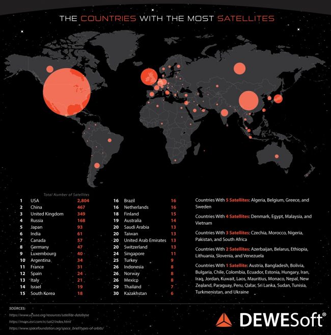 SpaceX, founded by Elon Musk, is an American company. The United States has the most satellites orbiting Earth, with approximately 2,804. That includes satellites that are governmental and those from entities that operate in the U.S. DEWESoft said: